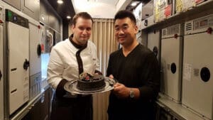 After take-off at 2:30am, it is time to hit the bed quickly but Leanne suggested to try out some Masala Chai (Tea) and we have a celebration cake as dessert before going to sleep. The cake was huge and very rich chocolate. I invited other crew and passengers to join me in “The Lobby” lounge area on the A380.