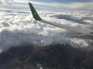 descending into Beirut over the snowy Lebanon mountain range